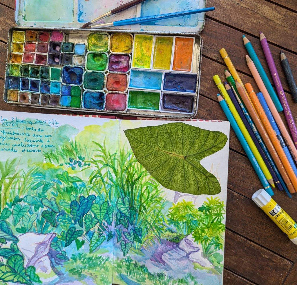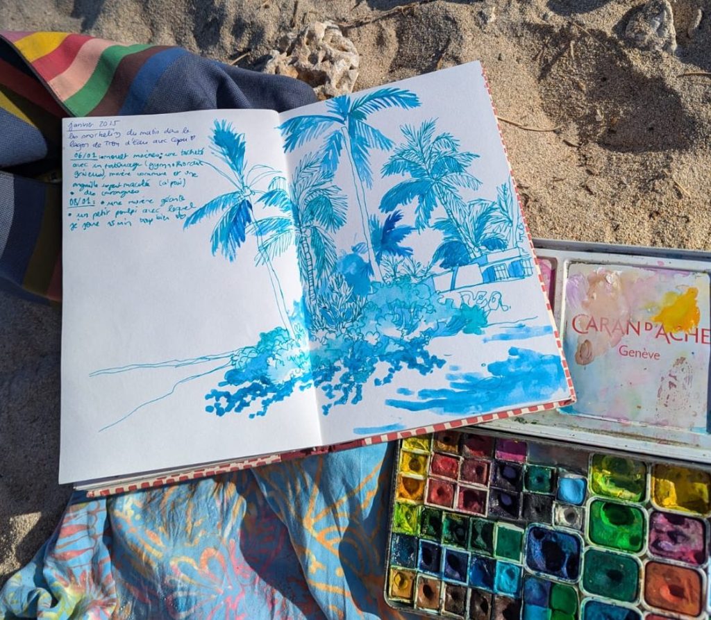 - Je prépare ma palette et mes crayons en fonction de la destination. Par exemple beaucoup de vert et de bleu pour la Réunion. Au fil des années je sais quels crayons et quelles peintures me plaisent, j’essaie de garder ça assez léger, tout rentre dans une trousse