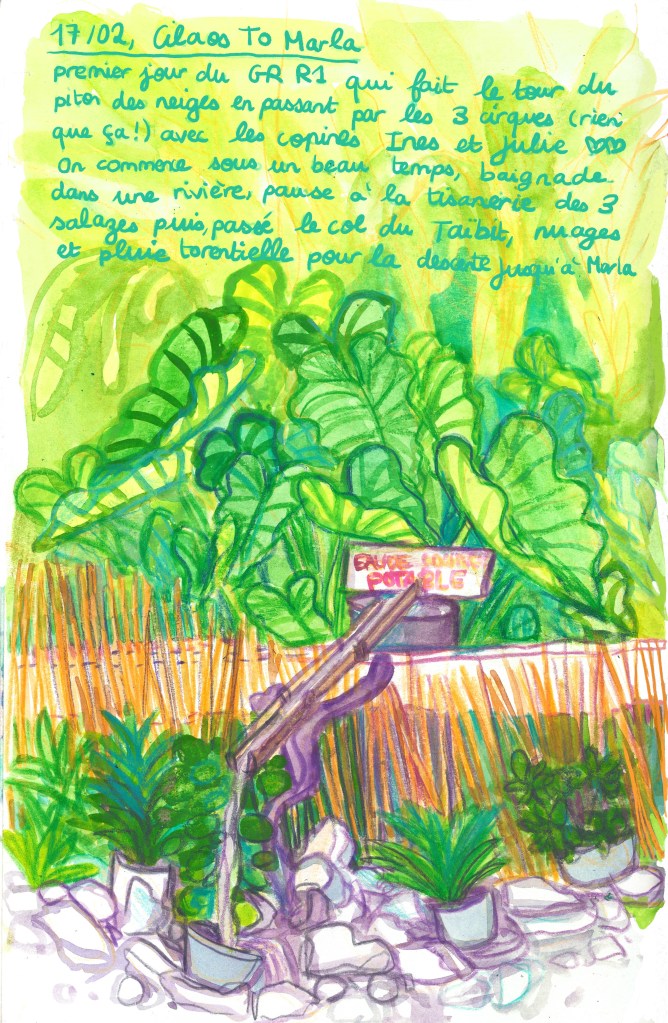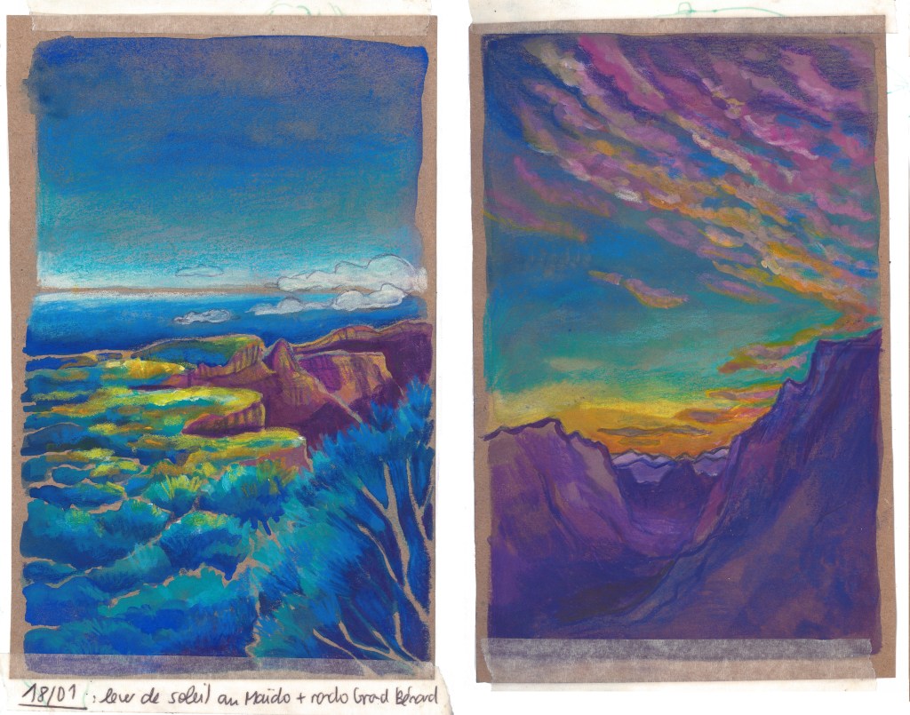 Je consacre la majeure partie de mes weekends à arpenter Mafate, Cilaos, Salazie, le piton des neiges ou celui de la Fournaise. Les randonnées sont infinies sur l’île intense. Ca alourdit le sac de randonnée, mais je ne pars jamais sans mon carnet et ma palette.