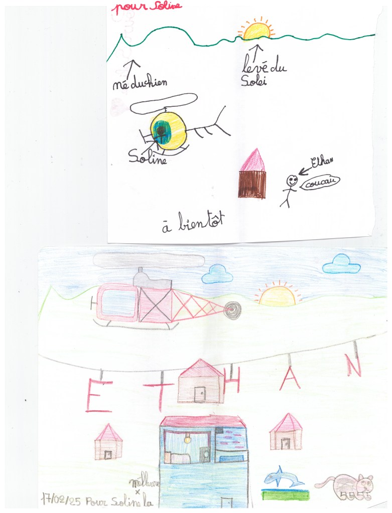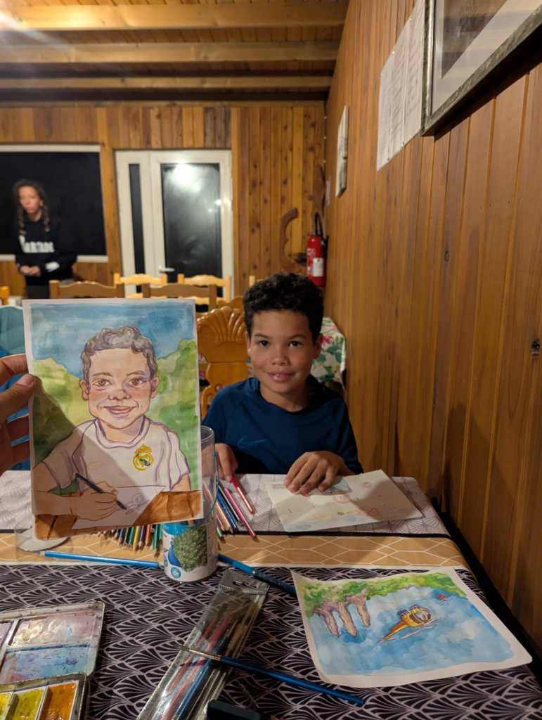 Ce que j’aime le plus dans les carnets de voyage, c’est que ça permet de se faire des amis. Une soirée dans un gîte à Marla, Ethan (dont les parents sont les hôtes) me voit peindre et ni une ni deux me propose un concours de dessin d’hélicoptère dont il est fan (pilote d’hélicopter est son deuxième choix de carrière après footballer pro). S’en suit une soirée de dessin partagé et de conservation animée. J’en apprends tellement sur les hélicos !
