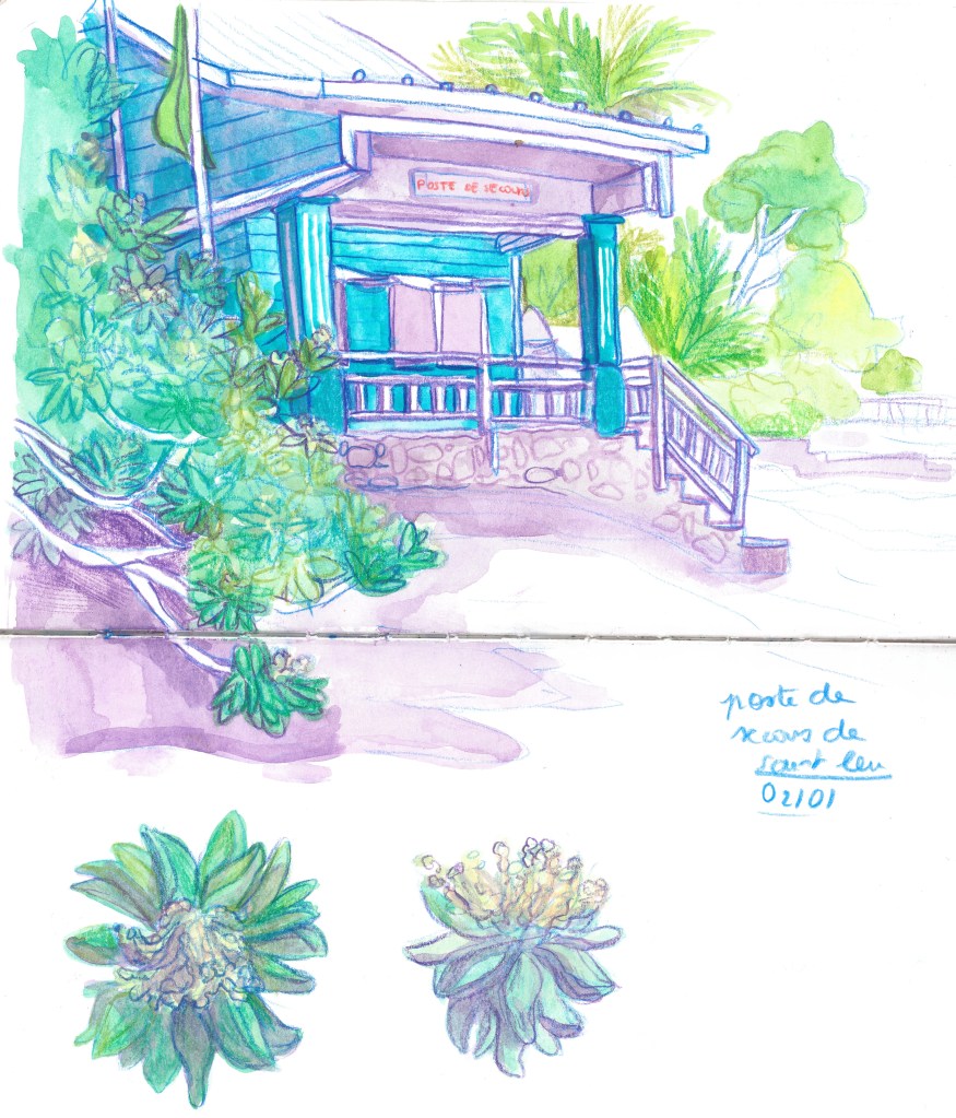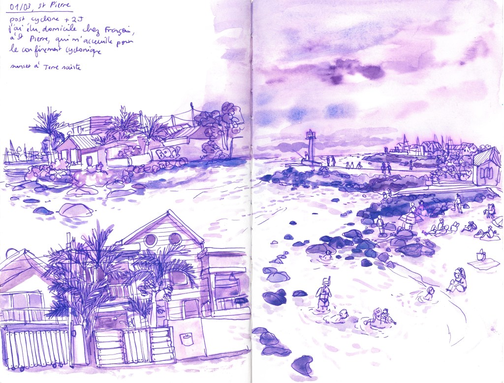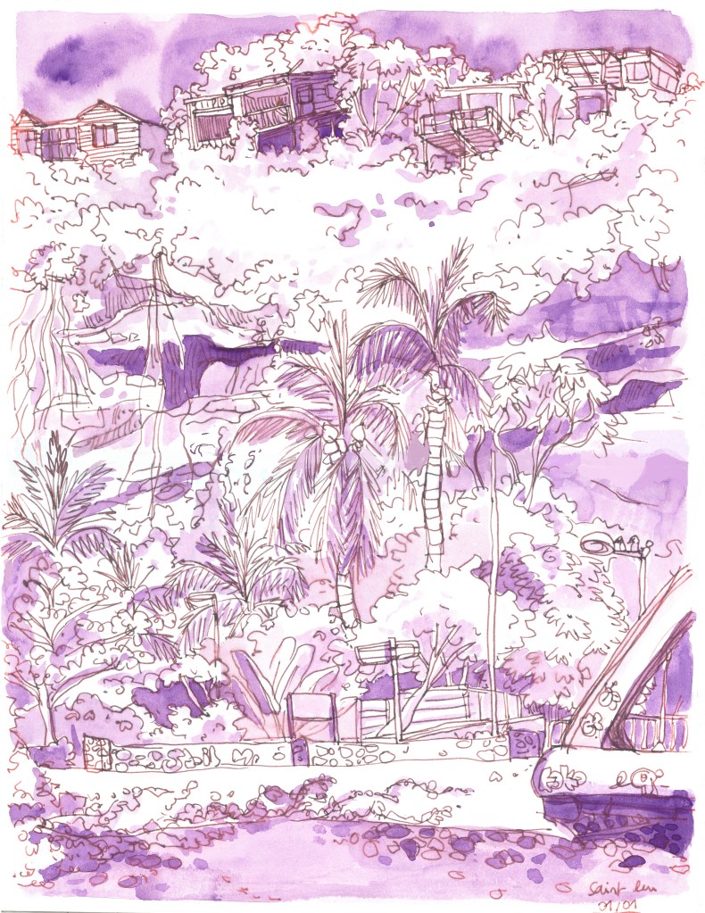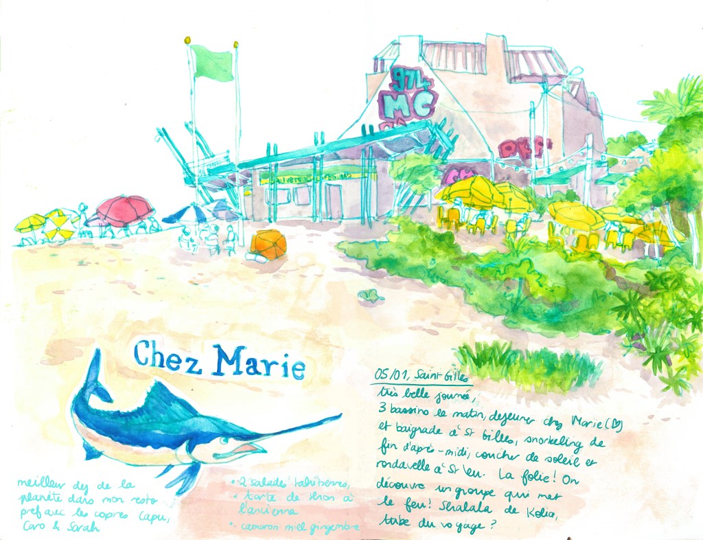 Et pour finir un petit dessin de St Leu, ma ville de coeur. Baba cool au possible, tournée sur la mer et le lagon, tournée sur le partage et la musique avec les Rondavelles (notre rendez vous immanquable du dimanche soir). St Leu, ou je me sens à la maison.