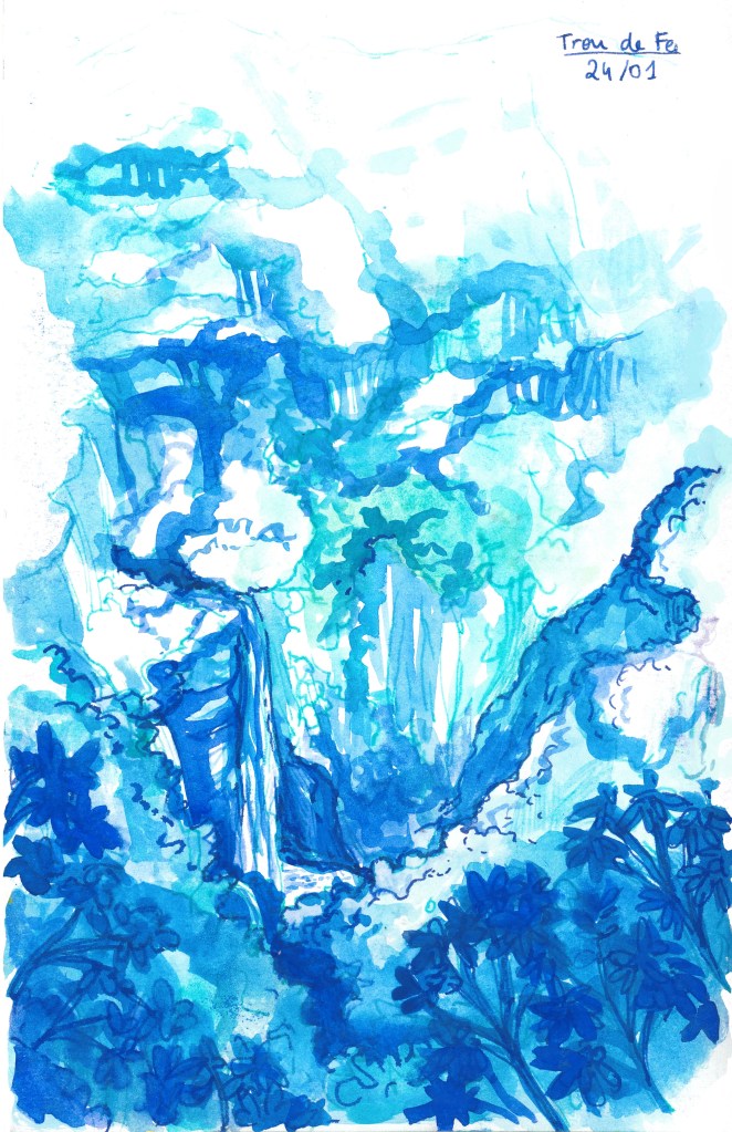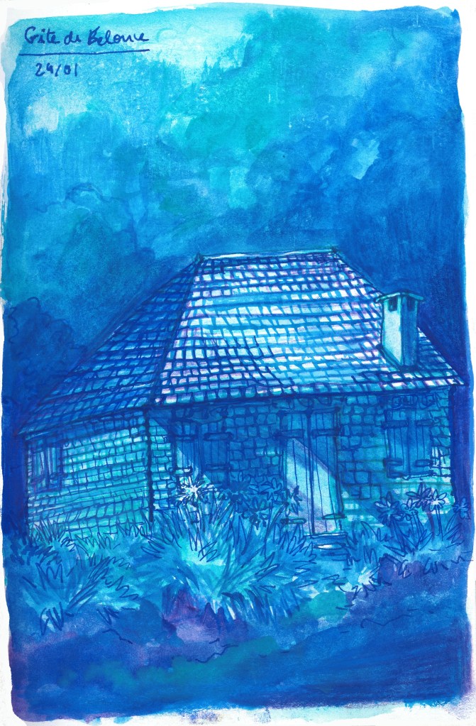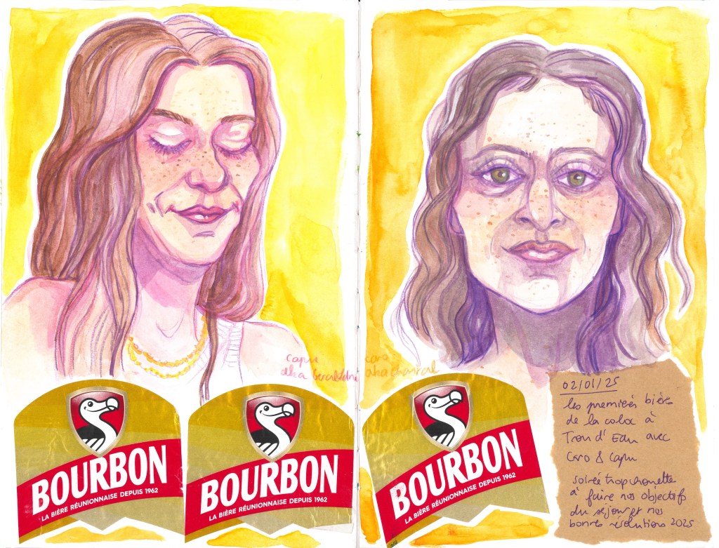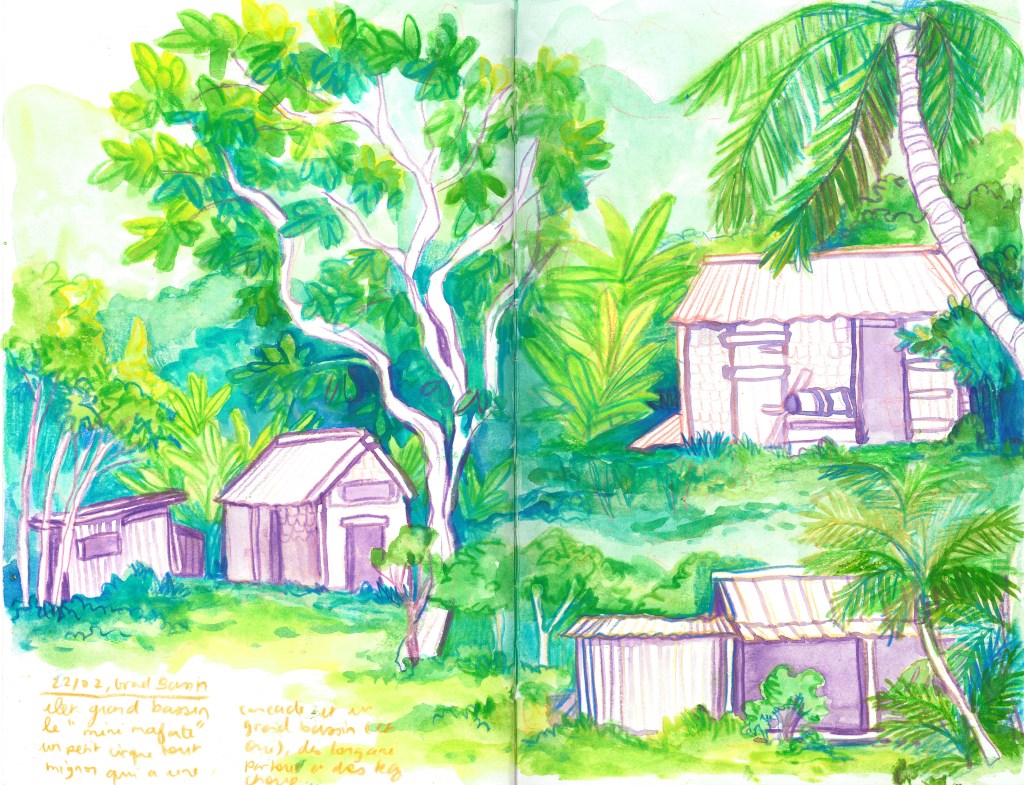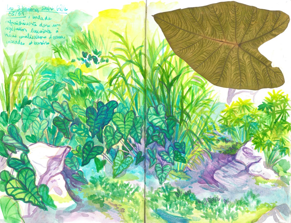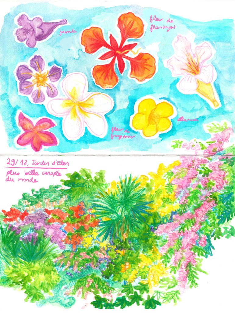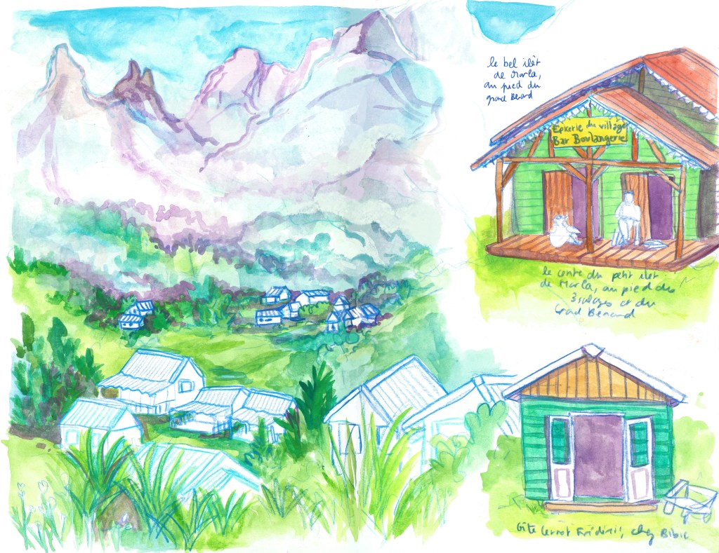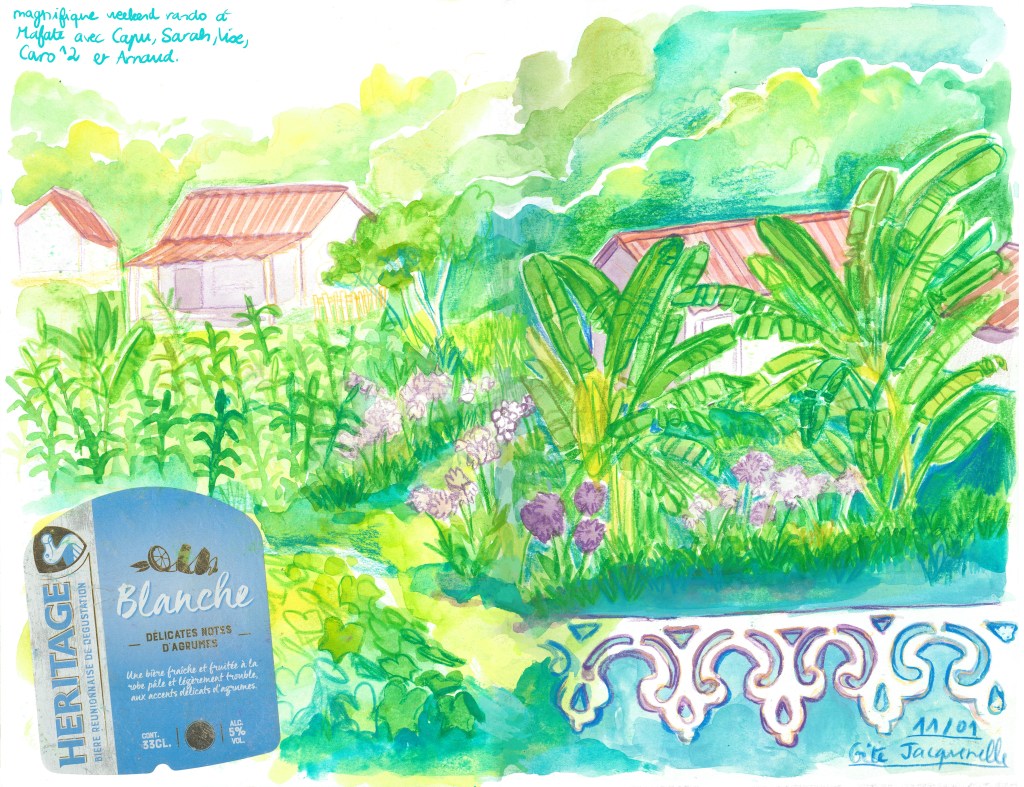 Mon histoire d’amour continue avec la Réunion. Quatre ans après, j’ai l’impression de rentrer à la maison, de retrouver ses odeurs familières, ses couchers de soleil qui n’existent nul part ailleurs, le vert éclatant de sa végétation folle. Pendant ces quelques mois délicieux, je m’émerveille de tout et je ne sors jamais sans mon carnet de dessin car chaque virage de route, chaque sentier escarpé raconte une histoire que j’ai envie de mettre en couleur. Comme pour mieux l’observer, m’en approcher, et en ramener un peu avec moi.
