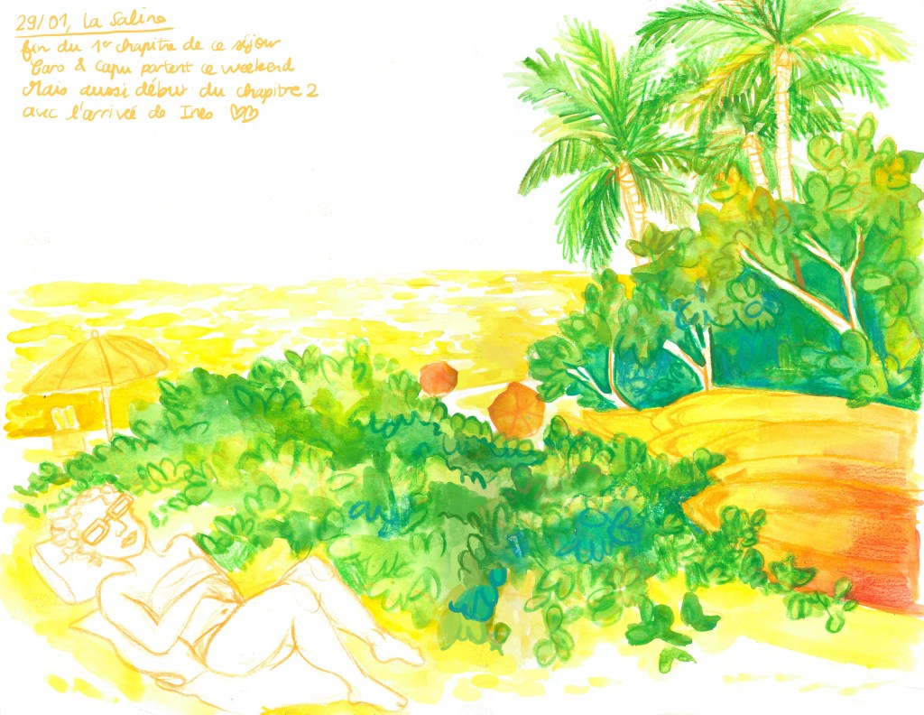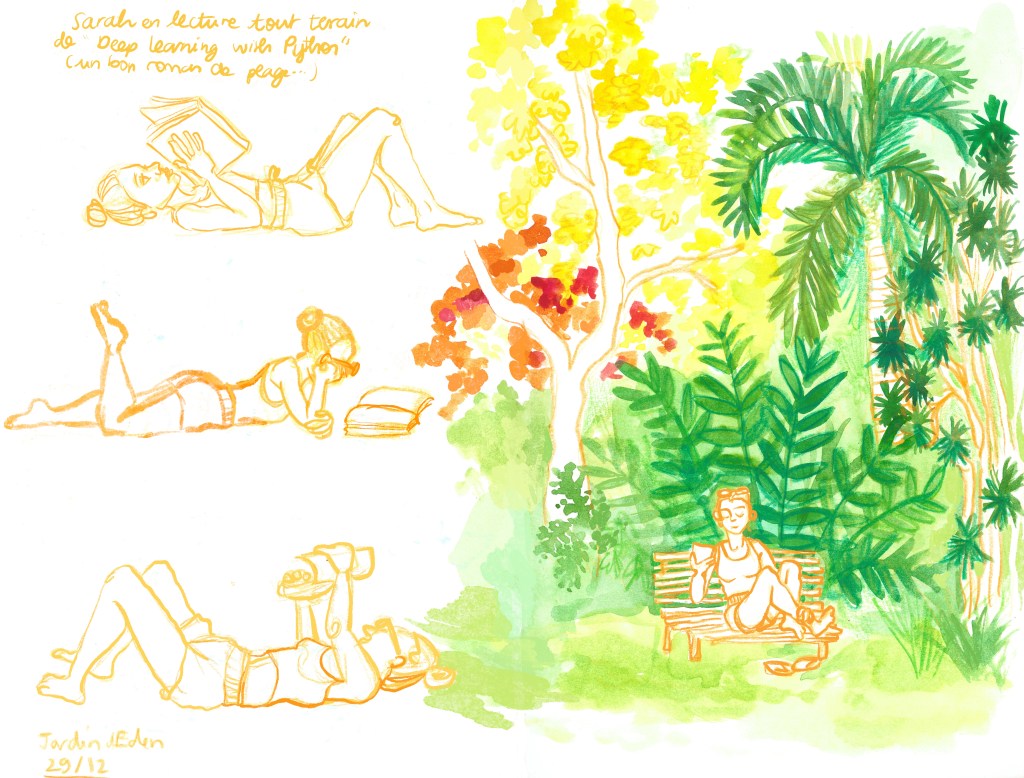 Ma première journée sur l’île je la passe dans ce jardin botanique avec ma super copine Sarah qui lit (croyez le ou non) un livre sur le Machine Learning, pendant que je dessine, je la dessine. On se prélasse au soleil, sans trop de moustiques (miracle) avant de partir admirer un coucher de soleil sur la plage. Les vacances commencent si bien.