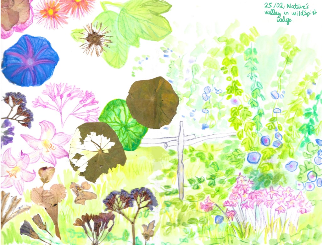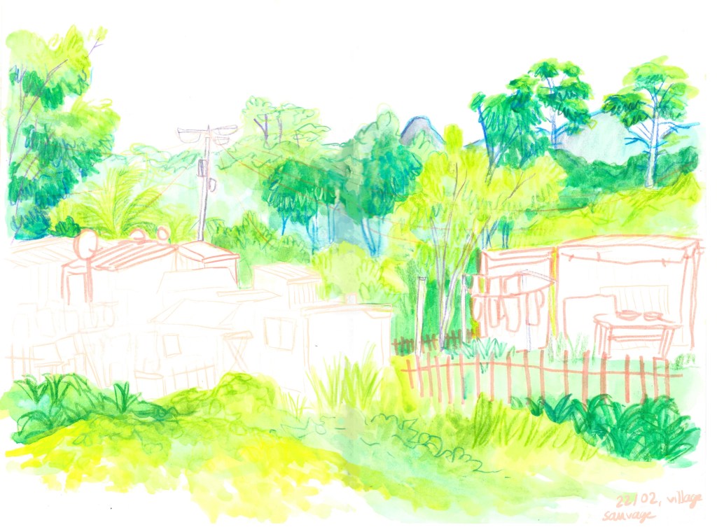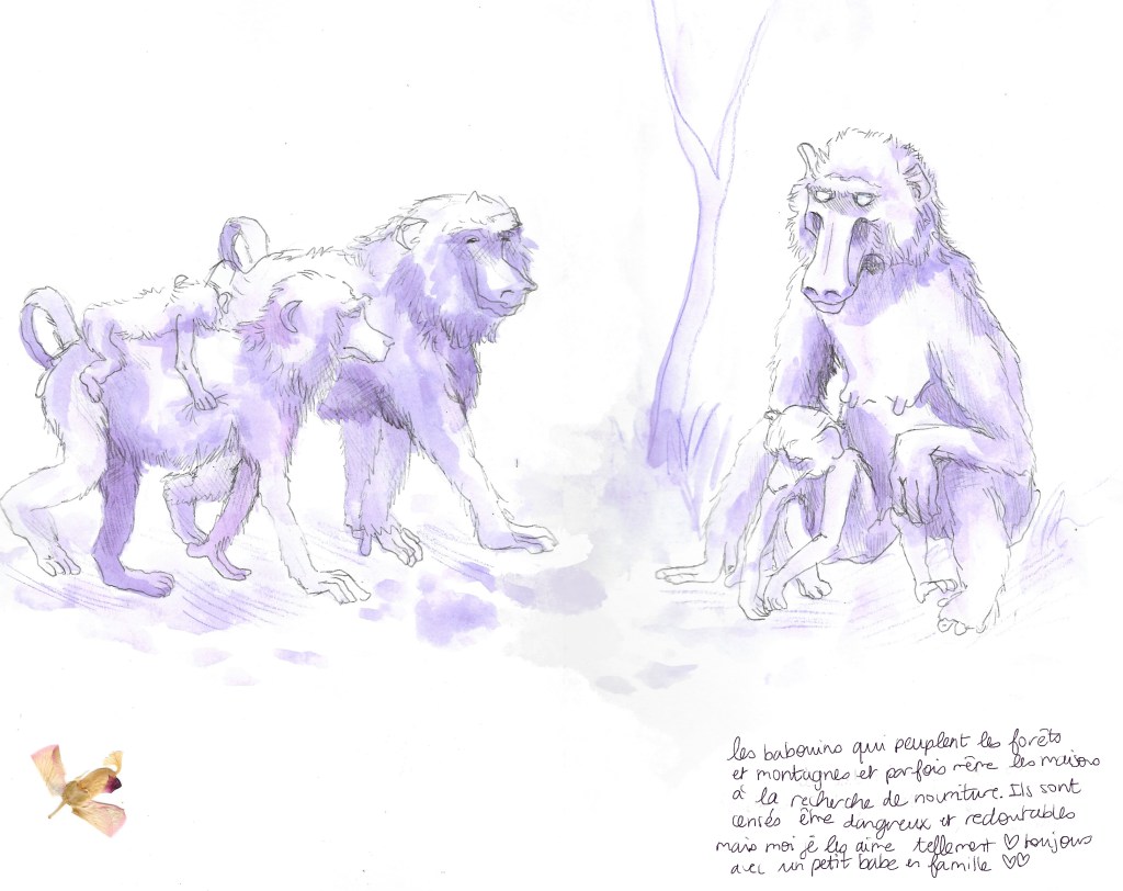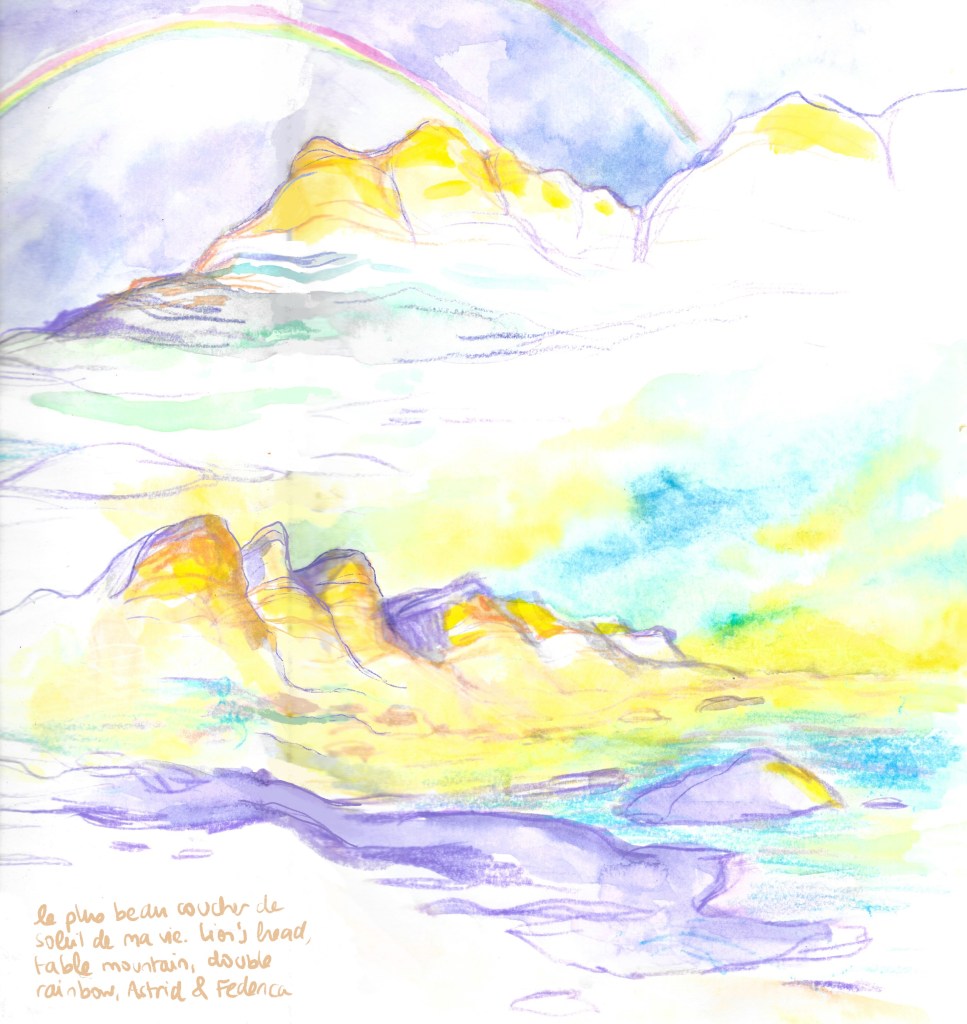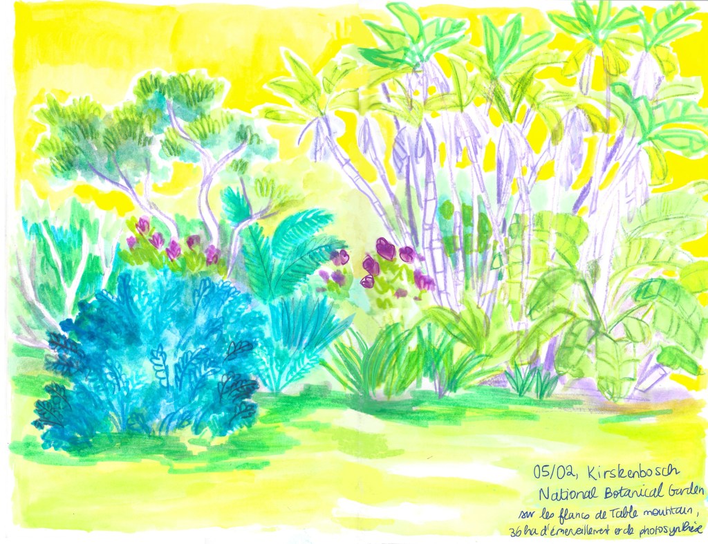 Le plus grand trésor de l’Afrique du Sud. Cet énormissime parc naturel et ses majestueux habitants nous mettront des images inoubliables dans la tête. Une semaine d’emerveillement continu, de rencontres à couper le souffle, de nature puissante. Je suis tellement fascinée et estomatchée par tant de beauté que je ne sors pas mon carnet de toute la semaine. Un petit dessin souvenir tout de même sur le trajet retour.