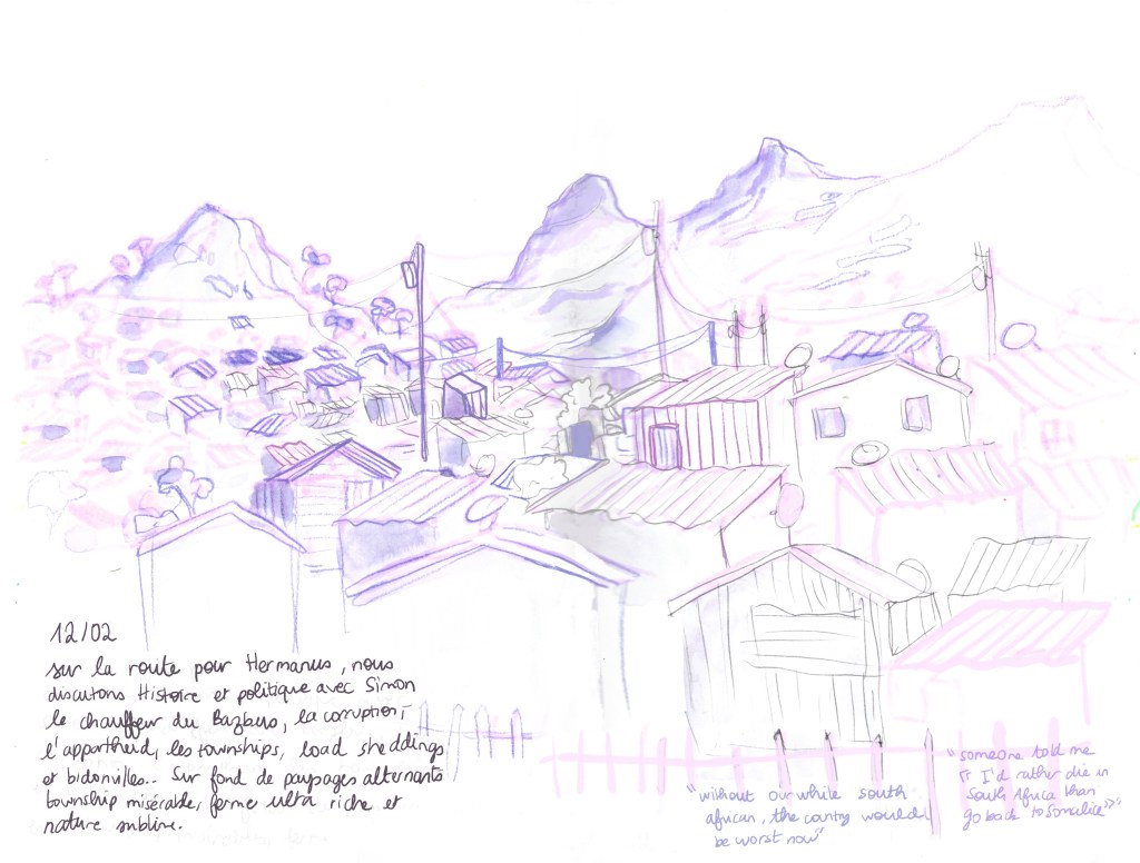 Malgré la beauté de Cape Town, on est confrontées très rapidement à la réalité du pays. Cape Town une ville ou ne vivent presque que des blancs et ou les noirs, vivant dans les township périphériques, paient des navettes journalières hors de prix, dans des embouteillages de plusieurs heures pour venir travailler en ville, serveurs dans les restaurants (remplis de clients blancs) ou nous dinons, caissiers au supermarché. On nous avait prévenues de faire attention à la sécurité, mais personne ne nous a préparé sur ces inégalités, dont on connait l’existence depuis la France mais dont on mesure difficilement l’ampleur, sur cette apartheid économique, sur tous les problèmes de drogue, pauvreté, sida… Cape Town une ville de toutes les richesses, entourée de townships pour la plupart dans la misère et qui sont encore moins vivables (accès à l’eau, à l’électricité, transport, violence) tous certains rapports que pendant l’Apartheid.